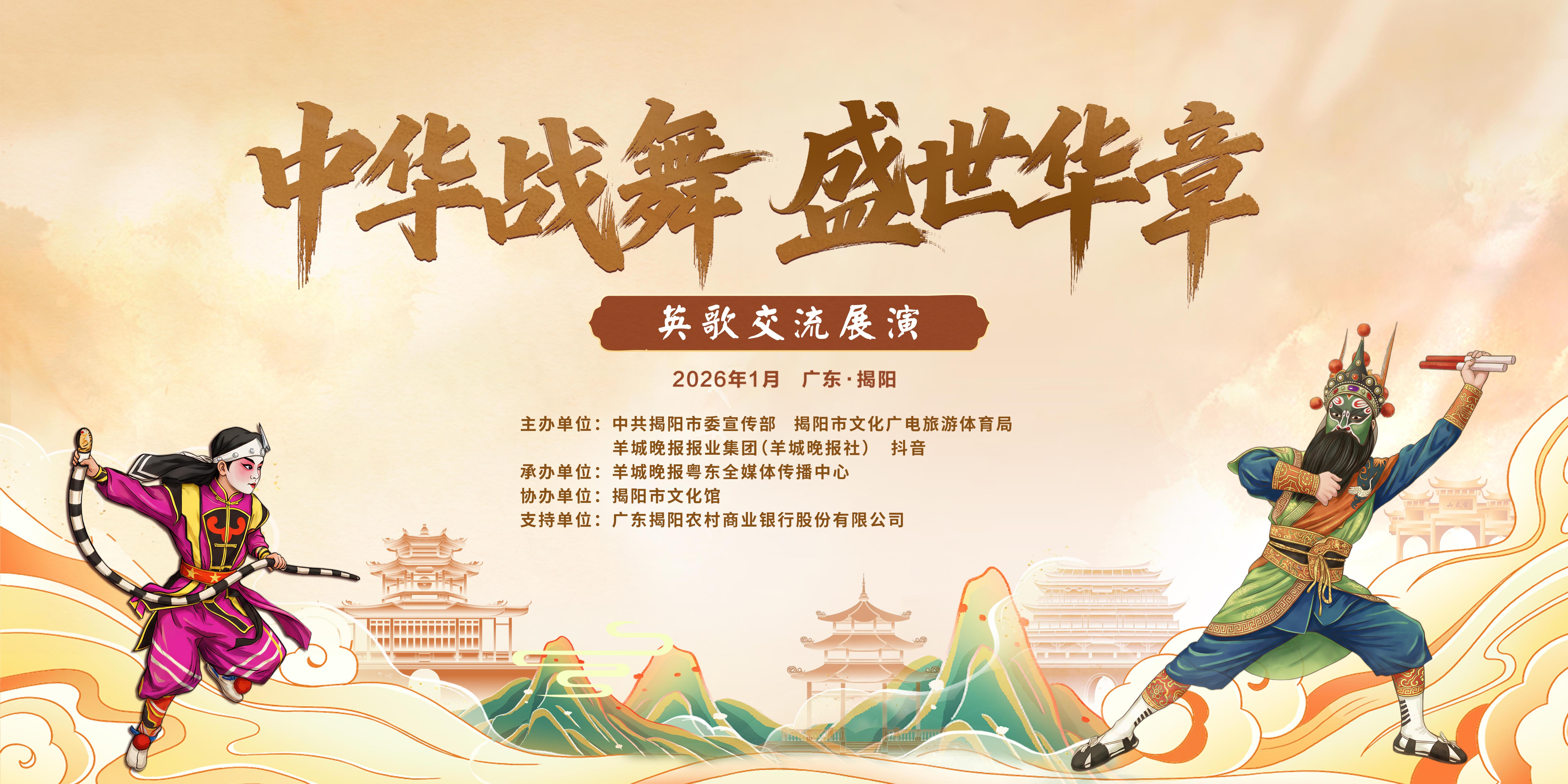 本次展演由中共揭阳市委宣传部、揭阳市文化广电旅游体育局、羊城晚报报业集团(羊城晚报社)、抖音联合主办,羊城晚报粤东全媒体传播中心承办,揭阳市文化馆协办,广东揭阳农村商业银行股份有限公司支持。整场演出将以“潮涌·三江聚英”“传承·古韵薪火”“创新·揭启新章”“共享·潮涌同心”四大篇章展开,全面呈现英歌文化的深厚底蕴与时代新姿。